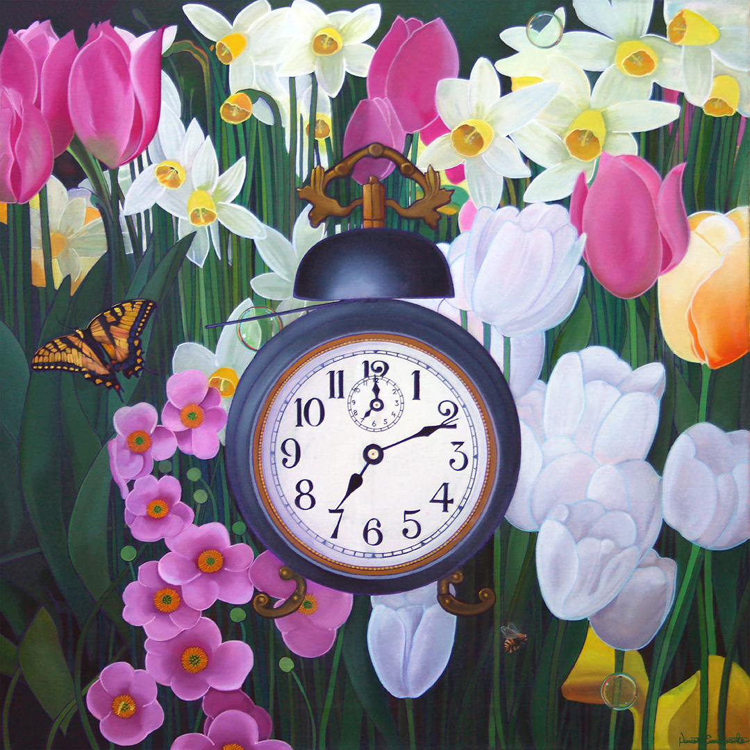 Represented by Bowersock Gallery, Provincetown, MA Tulip Time, Five Seconds to Seven, oil on canvas 36″X36″ Tulip Time, Eleven Minutes After Seven, oil on canvas 36″x36″ “Tulip Time,” a meditation on time and mortality.