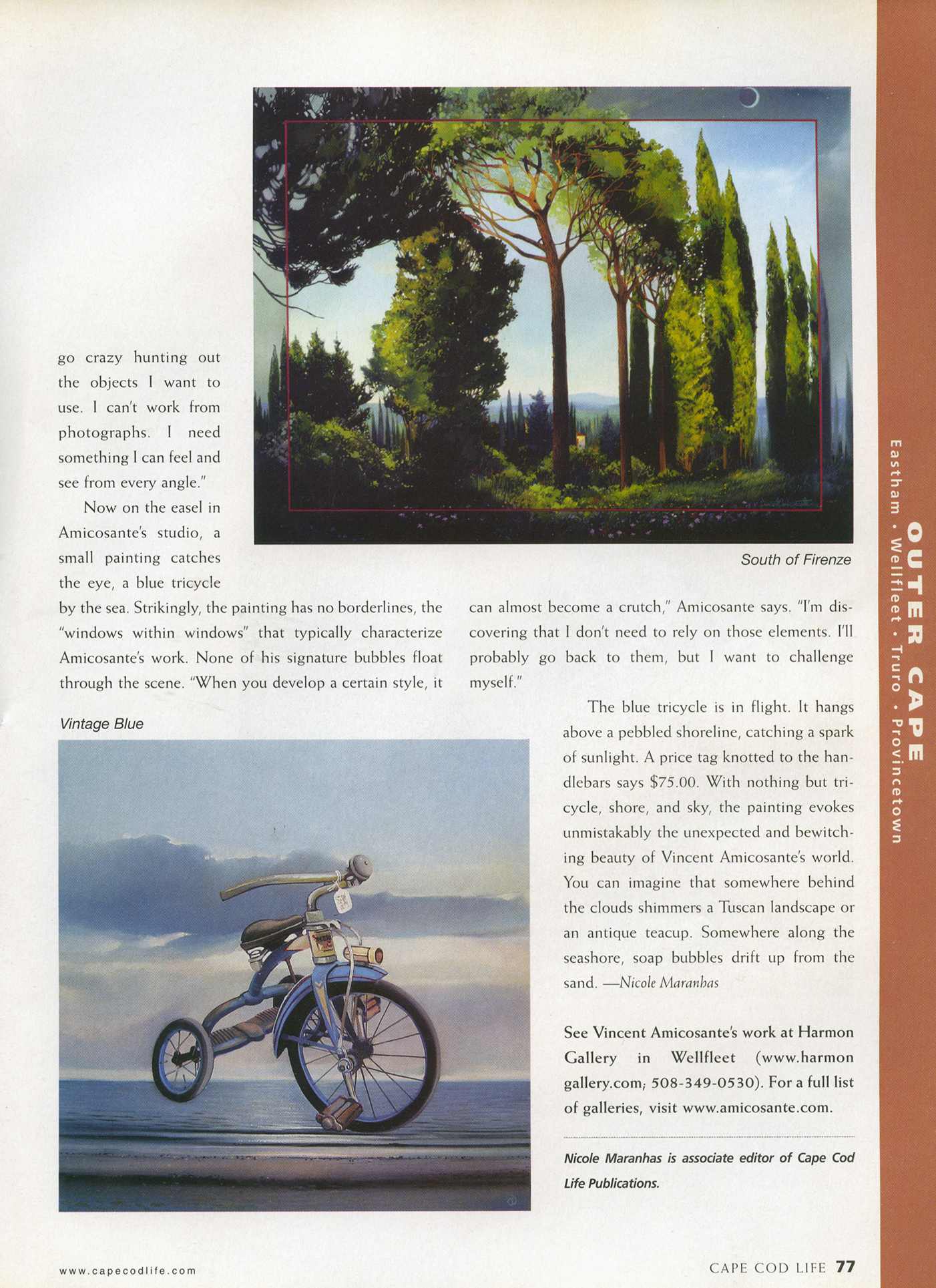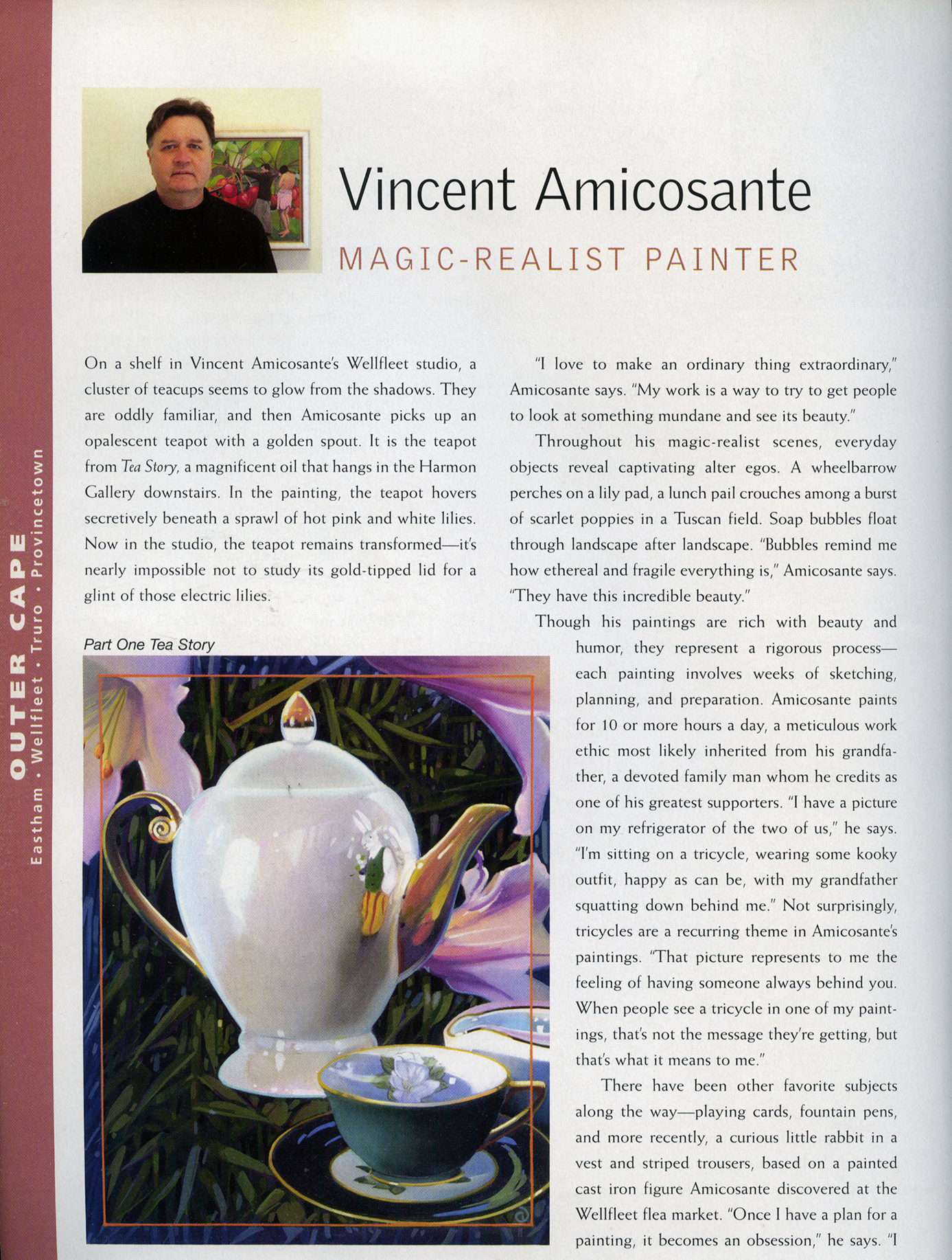 Wellfleet artist Vincent Amicosante says he’s thought a lot about perfection because he struggles to make things absolutely perfect in his paintings. Realizing that’s impossible, he tries to create the illusion that it’s ideal. “The underlying tone of nature is pretty much perfection,” he says. “That’s part of what always amazes me and the fact that I’m never going to achieve that. So in my work, I sort of revel in the fact that a lot of times it is not perfect. You can give the impression of being perfect, but if you study it, it’s really not perfect.”
