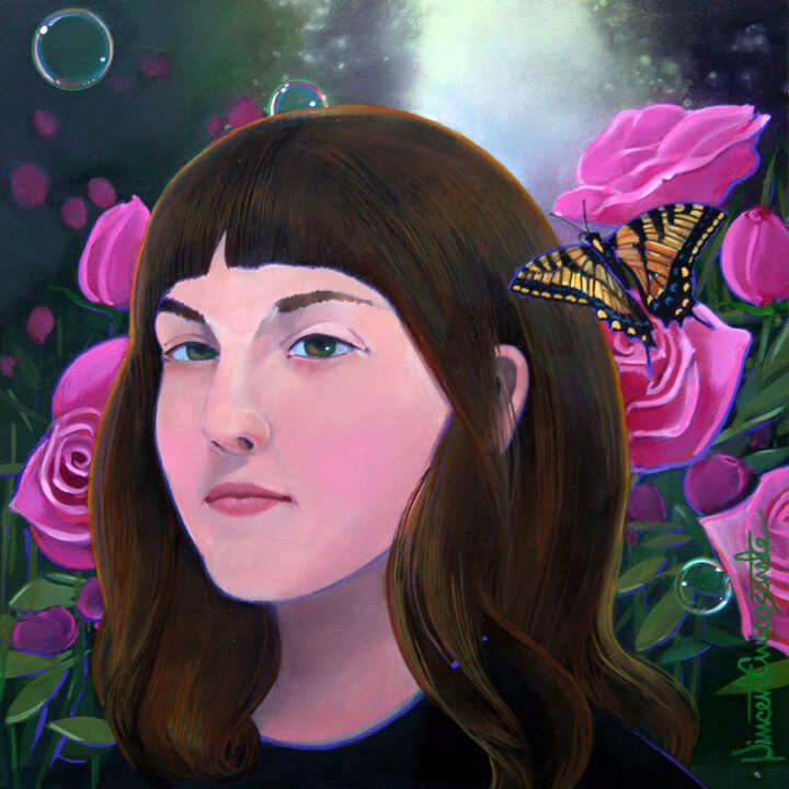 Throughout history, artists have had their muses. This series features the female models who became the focal points of many of the major works of painters, filmmakers, and writers. My first painting was of Grace Kelly, a renowned actress, and model; Alfred Hitchcock put her talents to work in several of his films. Next, was Lee Miller, a major talent in her own right as a model and a photographer; Man Ray was captivated by her and she appears in many of his works. Dante Gabriel Rossetti, a painter of the Romantic period and one of my major influences, painted Jane Burden Morris, an embroiderer and model. Anna Marie Gropius Mahler Werfel, a composer, author, editor, and socialite; Gustav Klimt painted her several times. Most recently I painted Alice Ernestine Prin, nicknamed the Queen of Montparnasse and often known as Kiki de Montparnasse, was a French artist’s model, literary muse, nightclub singer, actress, memoirist and painter. She flourished in, and helped define, the liberated culture of Paris in the 1920s. I worked from photographs that the artist used, painting the portrait in grisaille and the background in the style of the artist with my added embellishments.