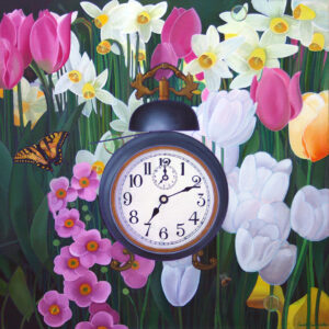In my new series of paintings, I incorporate elements that symbolize new beginnings and the finite nature of human life. The tulips, which bloom early in spring, and the clocks, symbolize the passage of time. The specific details are not as crucial as the end result – the fact that I’m still here.